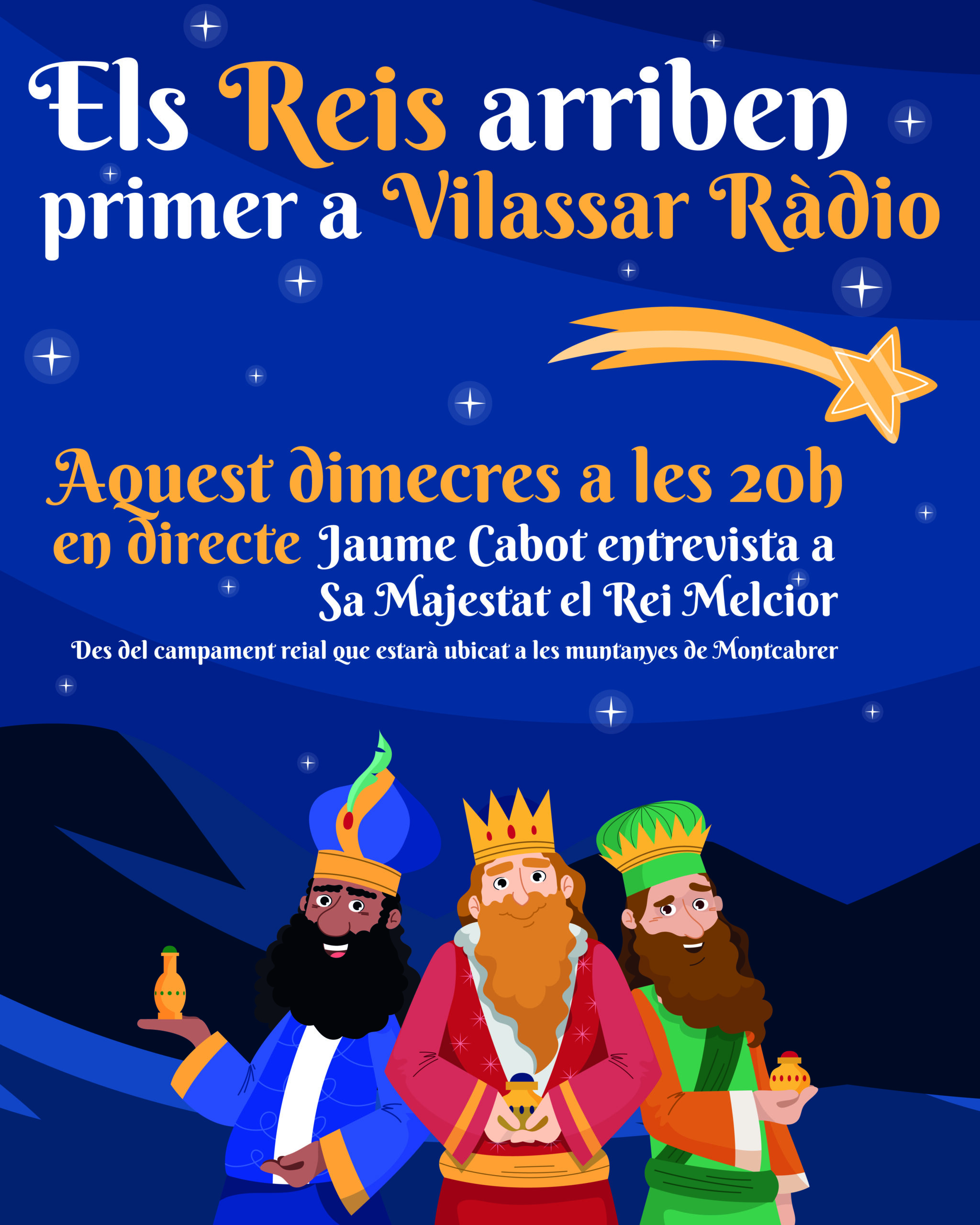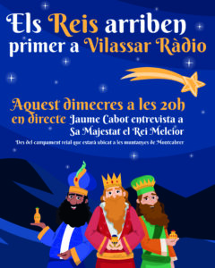 Avui és el Dia. El Dia més màgic de l’Any. A partir de dos quarts de sis de la tarda, Ses Majestats els Reis de L’Orient, començaran la tradicional Cavalcada pels carrers de Vilassar de Mar que, enguany si, es recupera en la seva totalitat després dels dos darrers anys de pandèmia. Vilassar Ràdio, com sempre, farà la transmissió, en directe, del traçat, dins de la programació especial que està emetent durant aquests dies i que finalitza demà. Avui, a partir de dos quarts de sis de la tarda. Per anar fent boca, ahir al vespre vam aconseguir parlar, en exclusiva, amb el Rei Melcior
