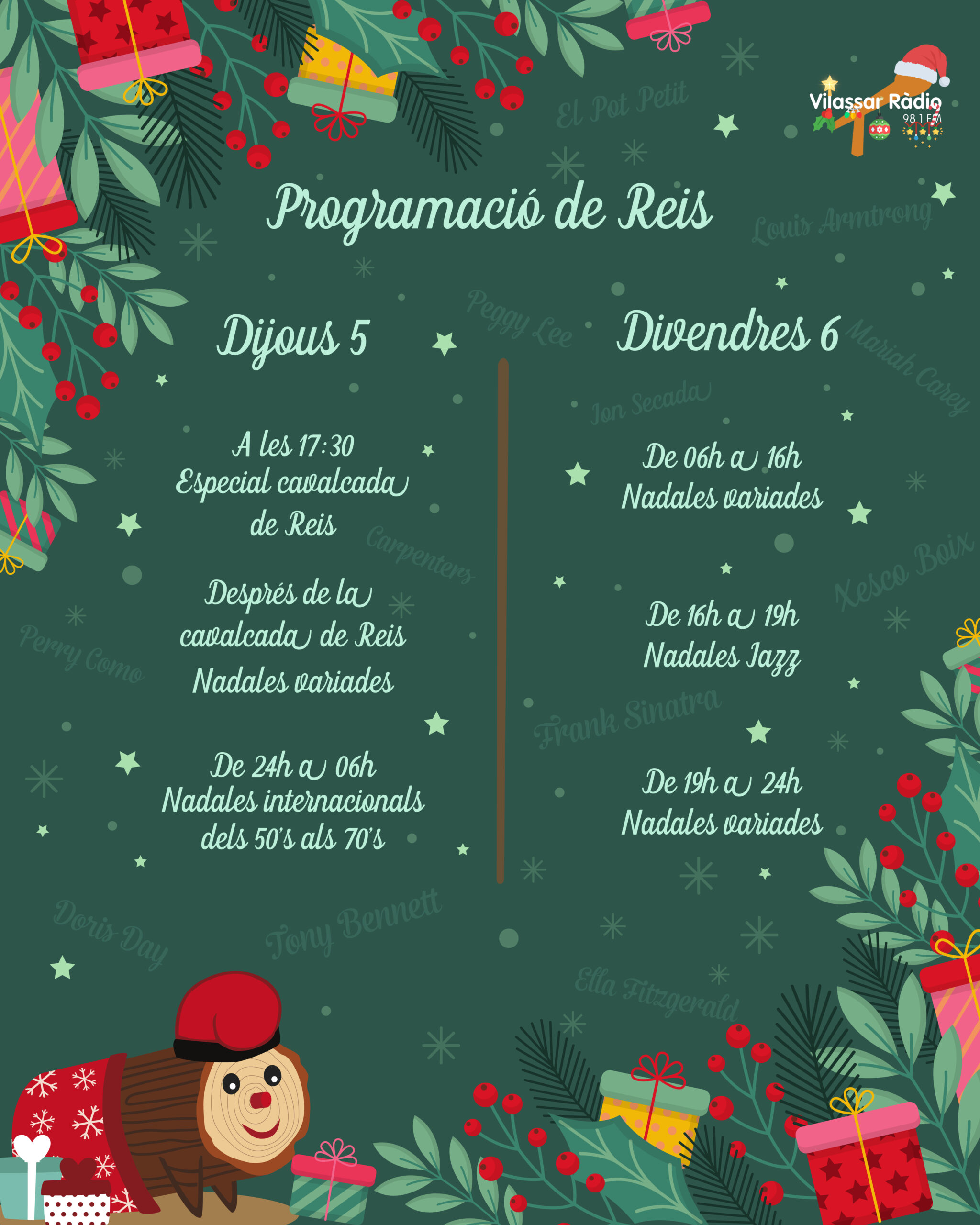 Després de la transmissió en directe de la cavalcada, emetrem un repertori variat de nadales fins a la mitjanit. Des de la mitjanit fins a les 6 del matí de demà, Dia de Reis, nadales clàssiques des dels anys 50 a 70. Més tard, de 6 del matí a 4 de la tarda, nadales de tots els estils. De 4 a 7 de la tarda nadales en versió jazz. I novament repertori variat de nadales fins a la mitjanit.