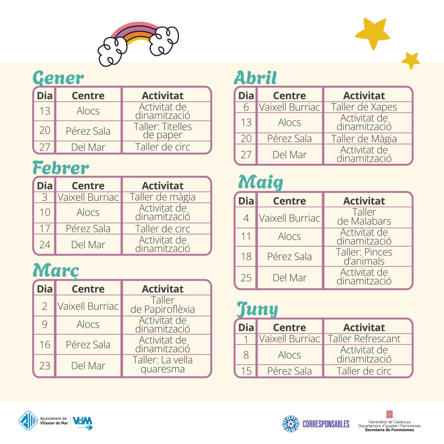L’Ajuntament de Vilassar de Mar, amb la col·laboració de les escoles públiques del municipi, continua aquest 2024 amb el programa Patis Oberts, amb l’objectiu d’oferir un servei gratuït de cura d’infants d’entre 4 i 12 anys, que compta amb personal dinamitzador. Les famílies que ho necessitin podran fer ús d’aquest servei tots els dissabtes de gener a juny -coincidint amb el calendari escolar- de 10 a 13 hores, a les escoles Pérez Sala, Vaixell Burriac, Escola del Mar i Els Alocs, en un format itinerant.