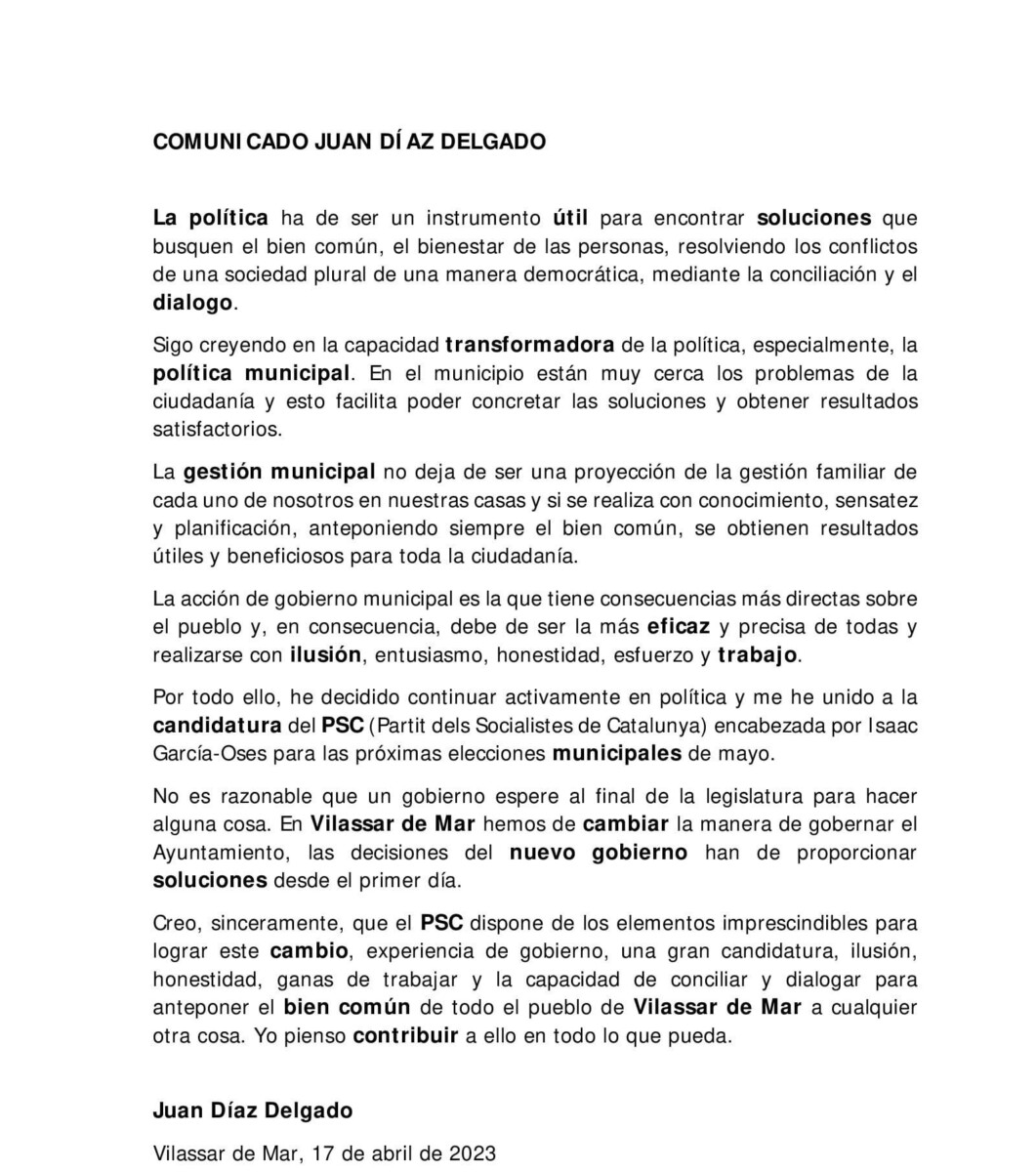 Consulteu el comunicat que Juan Díaz ha fet arribar a Vilassar Ràdio, aquí: