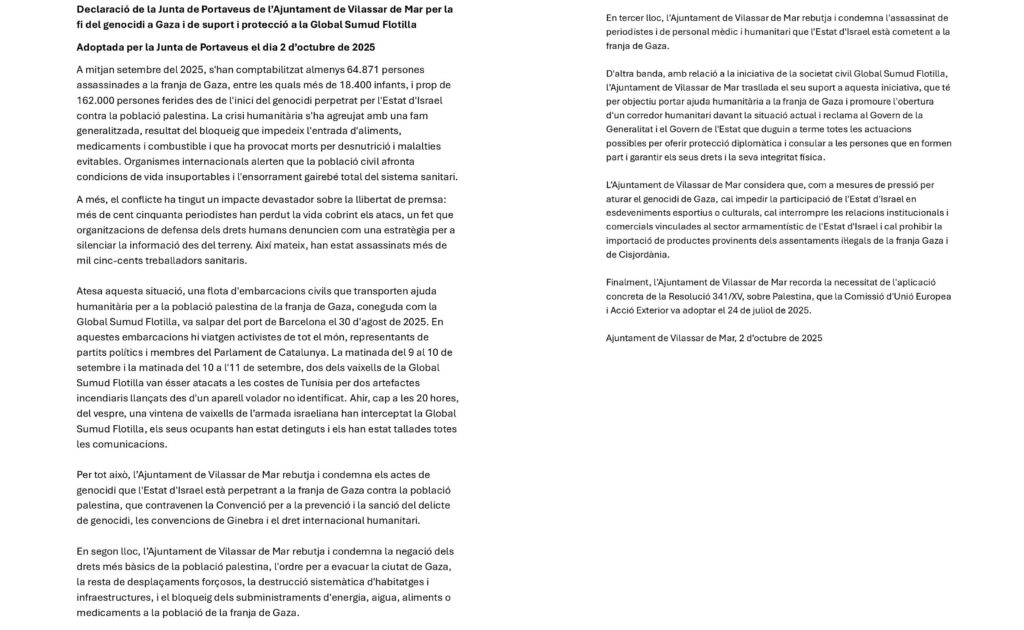 La Declaració Institucional aprovada, que podeu consultar en aquest enllaç, rebutja els actes de genocidi, la destrucció d’infraestructures, els desplaçaments forçosos i la negació dels drets bàsics de la població palestina. També expressa suport explícit a la Global Sumud Flotilla, que transporta ajuda humanitària a Gaza i reclama mesures de protecció diplomàtica i consular per als participants.