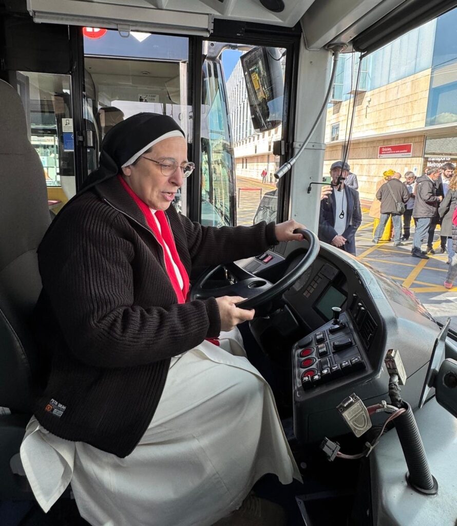 (Imatge: Sor Lucia Caram conduint un bus donat per l’Ajuntament de Barcelona/ Web Fundació Santa Clara)