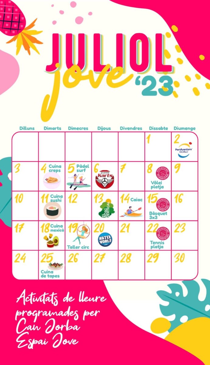 El programa del Juliol Jove inclou també tallers gratuïts a l’equipament municipal de can Jorba. Són quatre tallers de cuina (creps, sushi, mexicana i tapes) i un de circ. I també recorda els tres tornejos esportius municipals previstos dins l’Estiu Actiu: vòlei platja, el 8 de juliol; bàsquet 3×3, el 15 de juliol, i tennis platja, el 22 de juliol.