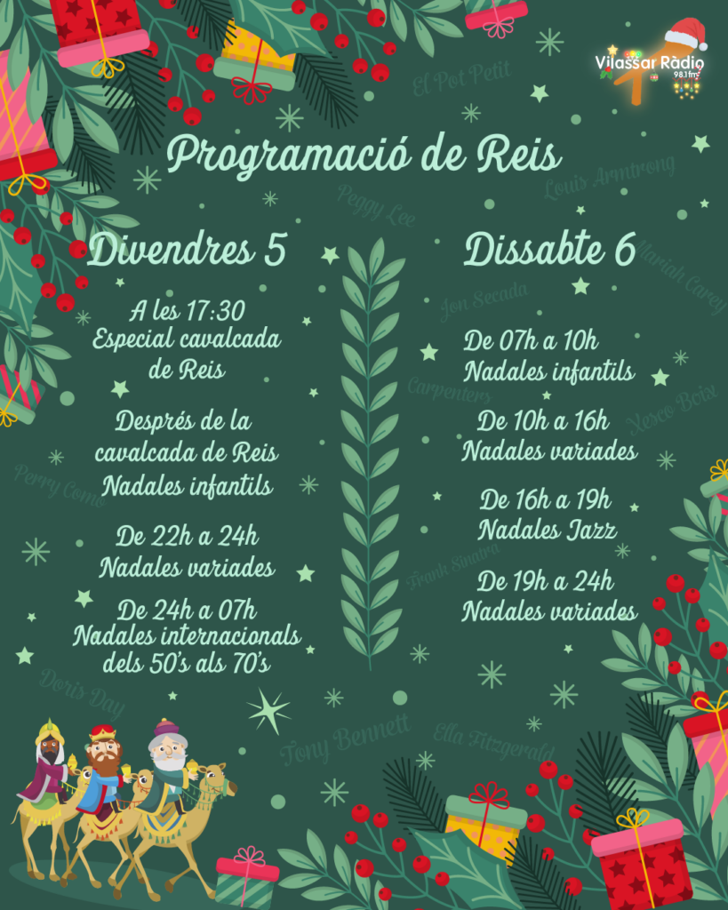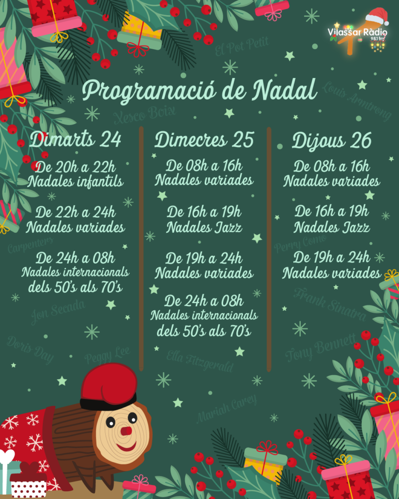 Amb artistes llegendaris com Tony Bennett, Frank Sinatra, Xesco Boix, Mariah Carey, Bing Crosby, Ella Fitzgerald, Michael Bublé i Nat King Cole, aquesta proposta musical ofereix un viatge sonor que farà vibrar aquestes festes amb la seva diversitat i encant. Renovada cada any, aquesta selecció ha estat dissenyada perquè sigui un autèntic regal musical que només es pot gaudir a Vilassar Ràdio.